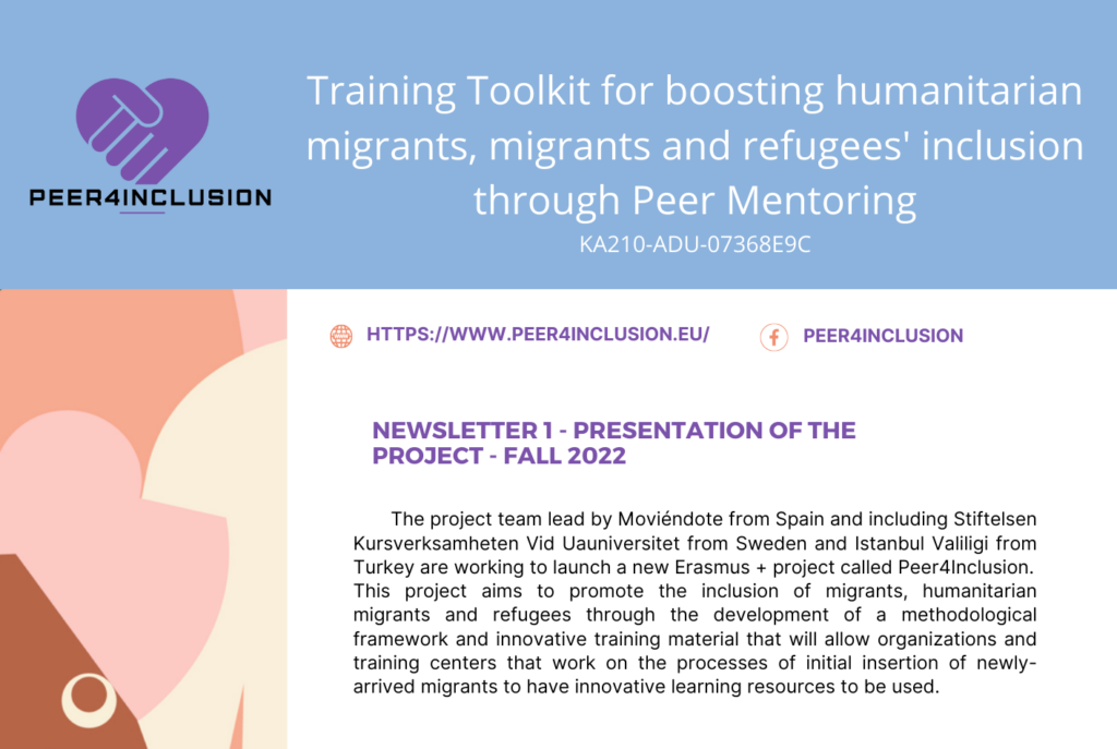 The Spanish Service for the Internationalization of Education (SEPIE) has approved the Peer4Inclusion: Training Toolkit for boosting humanitarian migrants, migrants and refugees inclusion through PeerMentoring project, within the framework of the Erasmus+ 2022 Call. This initiative is led by 3 European organizations, specialists in working with migrants and refugees, as well as in adult education. …